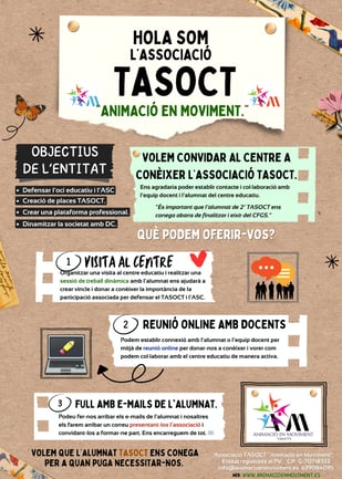 Ens trobem en plena campanya de contactes amb centres educatius, amb l'objectiu de crear relacions de col·laboració per a que l'alumnat de TASOCT ens conega. Volem que l'alumnat TASOCT ens conega per a quan puga necessitar-nos.