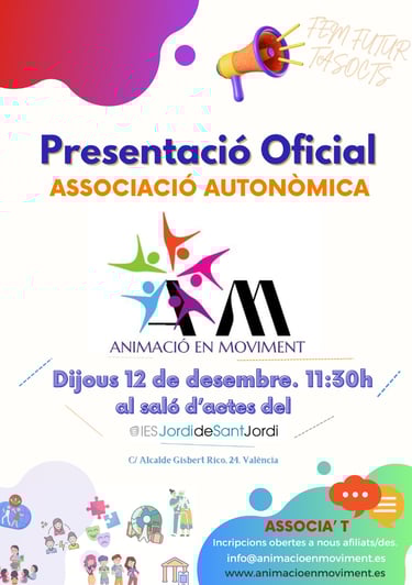 Després de 2 anys de treball per a formalitzar els pasos i procediments previs per a constituir l'associació poguerem celebrar una presentació oficial de l'entitat "Animació en Moviment". L'acte va estar acompanyat de grans referents de l'animació sociocultural i professorat del IES Jordi de Sant Jordi, centre educatiu pioner en la implementació de la figura TASOCT.